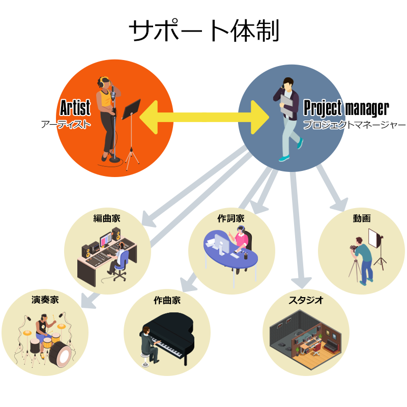 当レーベルに所属している方はプロジェクトマネージャーが楽曲制作から音楽配信開始までを管理してくれるので音楽家の方たちは活動しやすくなり面倒な手続きなどが不要となります。